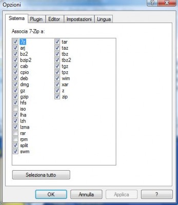 Nella nuova finestra che si aprirà, nella scheda “Sistema” si dovrà cliccare il bottone “Seleziona tutto” o in alternativa selezionare manualmente le sole estensioni dei file che si intende integrare a 7zip, infine cliccando su “Applica” e su “Ok” si salveranno le nuove impostazioni.