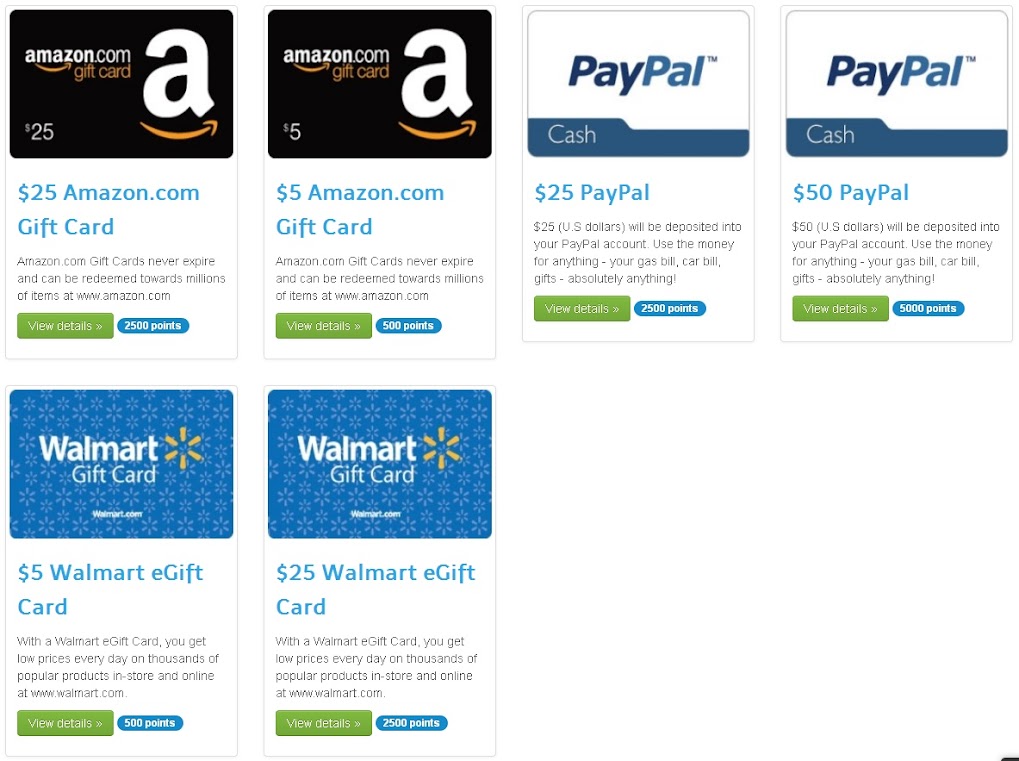Recandosi nella sezione premi è possibile scambiare i propri punti in Amazon e Walmart gift card oppure in credito PayPal.